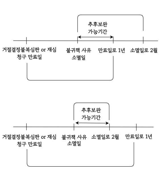 책임을 질 수 없는 사유가 소멸한 날부터 2개월 이내에 추후보완을 할 수 있다. 다만, 책임질 수 없는 사유가 소멸한 날부터 2개월 이내라고 하더라도 청구기간의 만료일부터 1년이 경과한 때에는 추후보완을 할 수 없으며, 귀책사유 없이 추후보완기간을 준수하지 못한 경우에, 이에 대한 추후보완은 인정되지 아니한다.